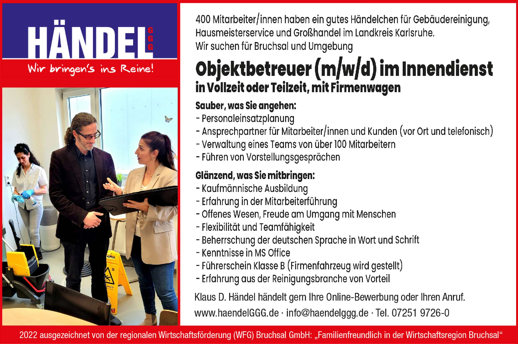 Hier finden Sie unsere aktuellen Jobangebote. Wir suchen dauerhaft Reinigungskräfte in Bruchsal und Umgebung. Neben einem starken Fokus auf Austausch und Integration legen wir als Unternehmen großen Wert auf Zusammenhalt und Weiterentwicklung.